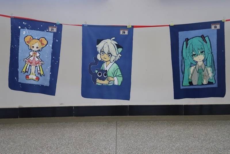 培训结束后,信息工程系隆重举行学员创意融合成果展示活动,集中展出学生创作的蜡染实操作品、手绘设计稿等作品。作品既保留了传统蜡染的质朴韵味,又融入了二次元的时尚语感,充分展现青年学子的文化理解力与创新表达力。参观者纷纷表示:“传统蜡染与二次元创意的碰撞令人耳目一新,既感受到非遗的魅力,又看到了文化的创新可能。”