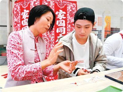 钟昀睿(左)指导台青体验剪纸技艺。蒋雪林摄