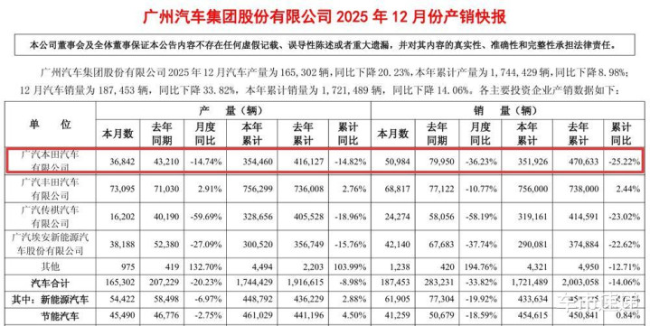 从广汽集团公开的产销快报不难看出,无论是2025年全年总销量还是12月销量,广汽本田都出现了明显的下滑,2026年广汽本田能否走出销量疲软,我们拭目以待。