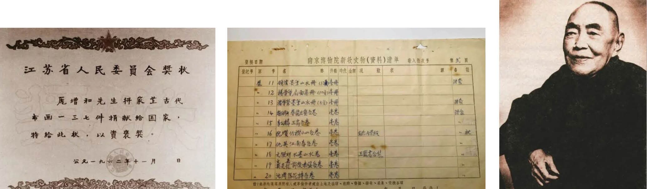 左图:1962年11月,江苏省人民委员会颁发给庞家后人捐赠古代书画137件的奖状。