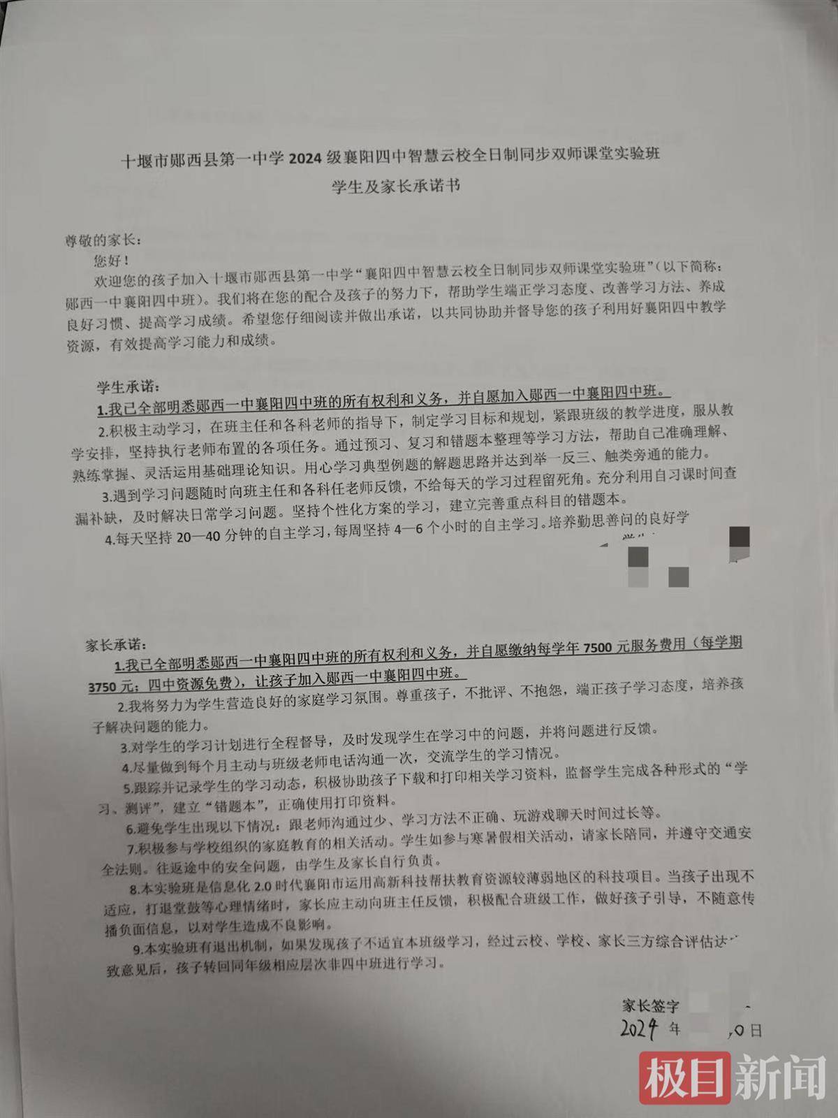 她向极目新闻记者介绍,“云班”项目在入学前均召开家长会进行说明,学生参与遵循自愿原则,并实行动态管理。目前,高二年级共1195名学生,两个“云班”学生仅92人。她透露,“上个学期末已有3名学生退出该项目,学校均已按规定办理退费。”此外,她还提供了部分学生及家长的承诺书。学生和家长均在承诺书上签字。