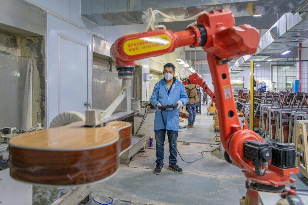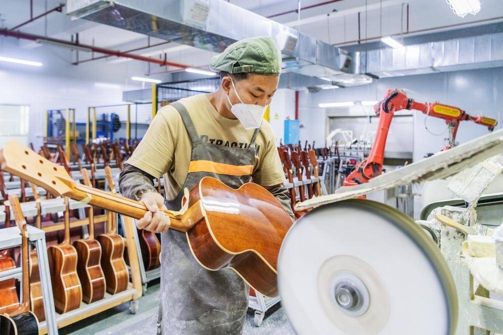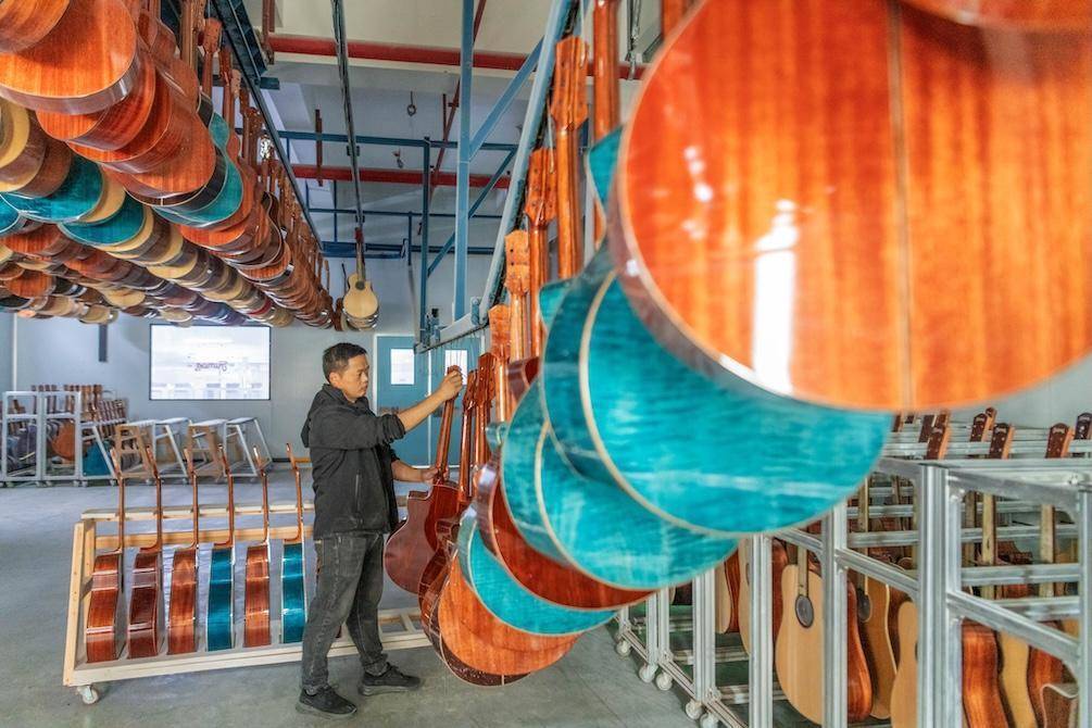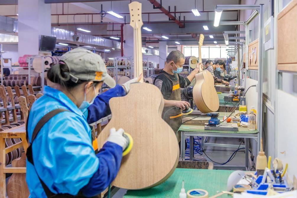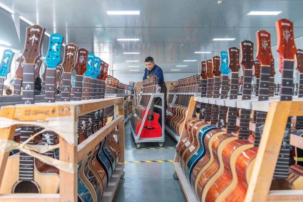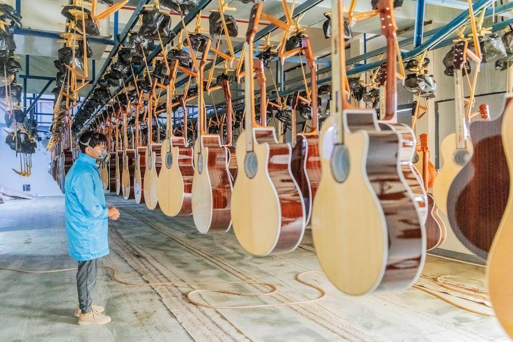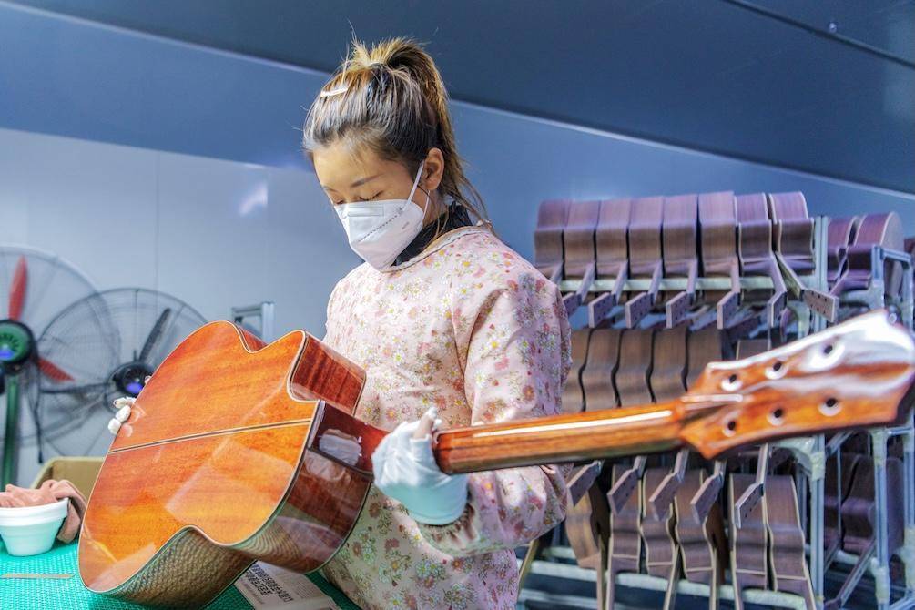 工人在生产车间赶制吉他。蔡小平摄
